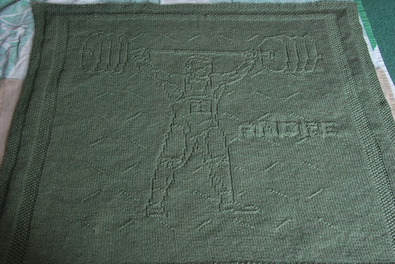A while back I promised you a photo of the finished body builder afghan that I designed and knit for a friend of my son. Well, they were thrilled with the results. I am hoping for a photo of the little guy with his blanket. It was a lot of fun to create this piece, though I am in no hurry to make another like it.